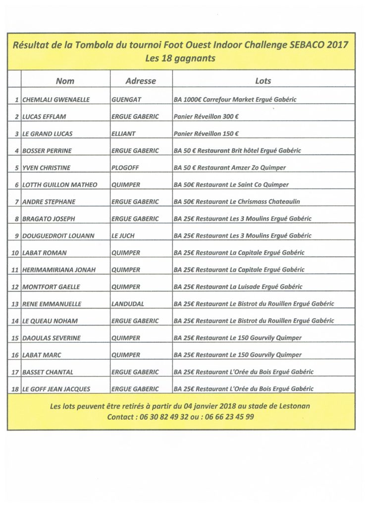 Résultat de la tombola du tournoi Indoor 2017 30 décembre 2017 Jean-Pierre Morvan Actualités, Actualités Foot Ouest Indoor, Ecole de Foot, Jeunes, Seniors, Tournois 0