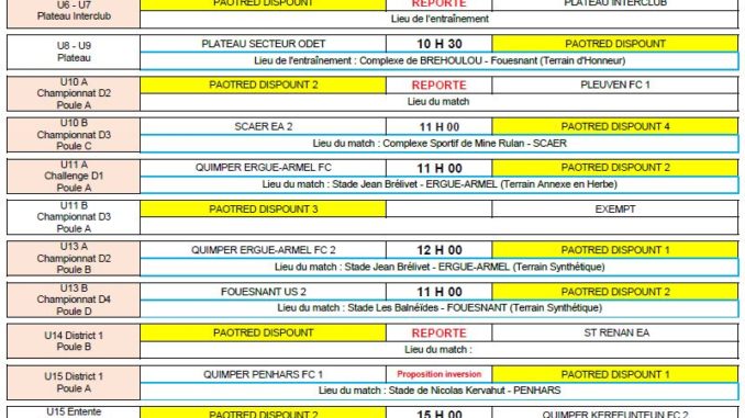 Arrêté Municipal Commune Ergué-Gabéric – Modification Agenda du Week-End 15 novembre 2019 Dam HUITRIC Actualités, Ecole de Foot, Jeunes, LE CLUB 0 En raison d’un arrêté pris sur la commune d’Ergué-Gabéric, certaines rencontres sont reportées et d’autres inversées ! Cliquez sur l’image pour prendre connaissance de ces modifications