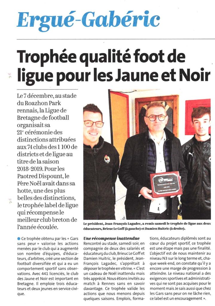 Nous étions de ceux-là et nous avons reçu la plus belle des distinctions : Le trophée Label de Ligue qui récompense le meilleur club breton de l’année 2018 2019