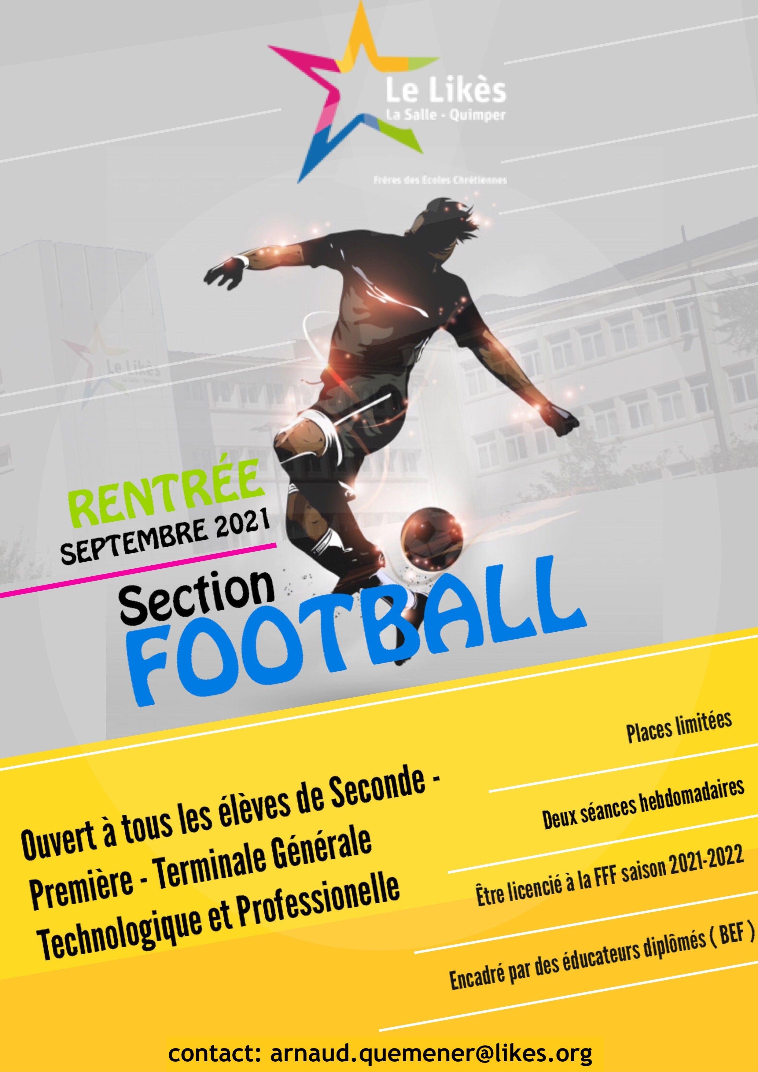 Créée en partenariat avec les Paotred Dispount Ergué Gabéric lors de la saison 2020-2021, le lycée Le Likès va mettre en place dès la rentrée 2021-2022 une 𝐒𝐄𝐂𝐓𝐈𝐎𝐍 𝐅𝐎𝐎𝐓𝐁𝐀𝐋𝐋. ![]()