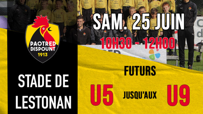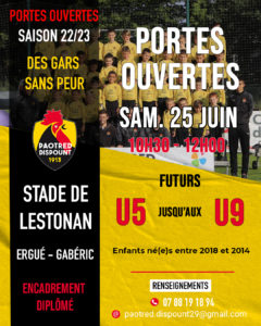 Portes ouvertes U5-U9 10 juin 2022 admin4412 Actualités 0 Viens t’essayer au football chez les Paotred Dispount le samedi 25 juin ! Portes ouvertes des catégories U5 jusqu’aux U9, enfants né(e)s entre 2018 et 2014 !