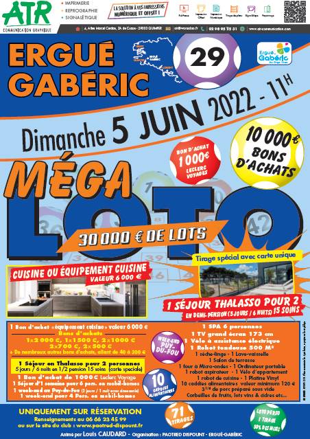 MEGA LOTO DU 7 JUIN 2026 INFORMATION FLYER Cliquez pour obtenir le flyer complet FLYER Cliquez pour obtenir le flyer complet BULLETIN INSCRIPTION Télécharger le bulletin d’inscription en cliquant sur l’image ci dessus Règlement Grille des gains REGLEMENT DU LOTO PERSO (Cliquez sur l'image) SALLE ERIC TABARLY CROAS SPERN 29500 ERGUE GABERIC Coordonnées GPS Latitude : 48.006653 Longitude : -4.024063 Situation géographique